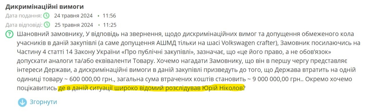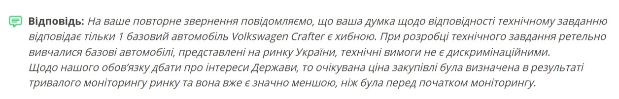 Замовник відповів, що думка аноніма про відповідність технічному завданню лише одного Volkswagen Crafter є хибною. Мовляв, при розробці техзавдання ретельно вивчалися базові автомобілі, представлені на ринку України, а технічні вимоги не є дискримінаційними.