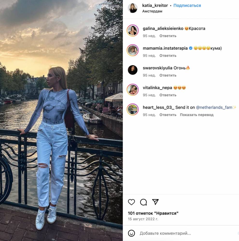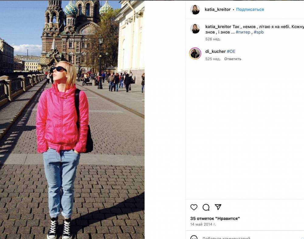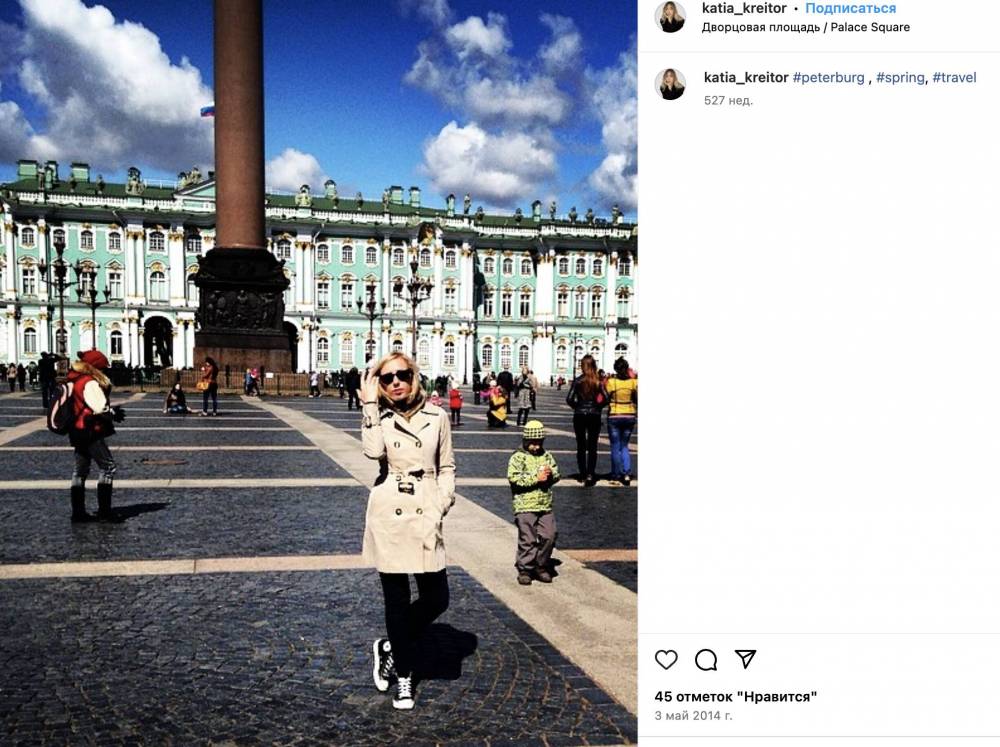 Найцікавішими для нас виявилися фото з поїздок Катерини Крейтор, де її також супроводжував чоловік. До знайомства з Андрієм жінка у травні 2014 року поїхала до російського Санкт-Петербургу. Тобто це сталося після окупації та анексії Криму та після початку бойових дій у Донецькій та Луганській областях України.