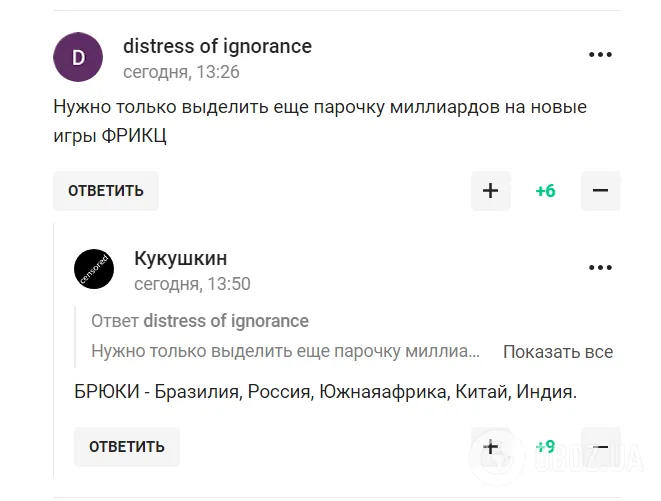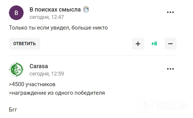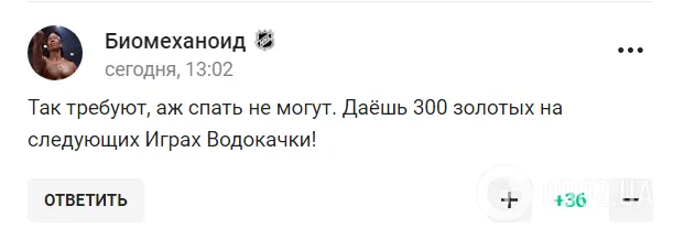"Міш, ти зовсім чи що? Табличку бачив?" ,"Цього вимагають глядачі та атлети інших країн" --- Де? Де можна прочитати про ці вимоги? Глядачам по барабану, вони і не помітили", "Олімпіаду в Парижі взагалі ніхто дивитися не збирається. Інфа сотка", "На колінах приповзуть , Так ", "Прямо вимагають і ніжками тупотять, повернути негайно спортсменів, ух", - стібуться користувачі.