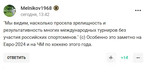 "Ми бачимо, наскільки просіла видовищність та результативність багатьох міжнародних турнірів без участі російських спортсменів. Впевнений, що скоро кількість змагань за участю наших спортсменів знову зросте. Цього вимагають глядачі та атлети інших країн", - цитує Дегтярьова "Р-Спорт".