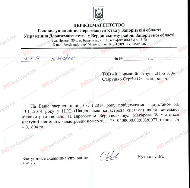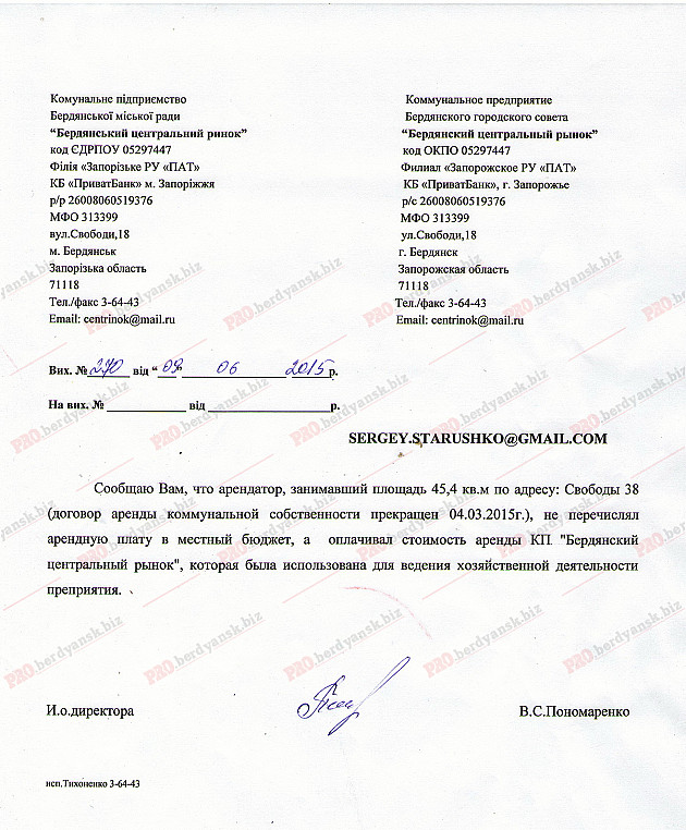 В апреле 2014-го года мы обратились в исполнительный комитет с информационным запросом, в котором попросили предоставить данные о том, сколько средств получил бюджет Бердянска с момента передачи указанных участков в аренду ЧП «СВЕТАЛ-2007», отдельно за каждый год. В ответе за подписью заместителя городского головы Анатолия Степаненко, говорится, что у финансового управления отсутствует информация о договорах аренды с частным предприятием «СВЕТАЛ-2007». Соответственно в бюджет никто ничего не оплачивал. Выходит, что эта организация бесплатно использует свыше 14 соток земли у моря бесплатно.