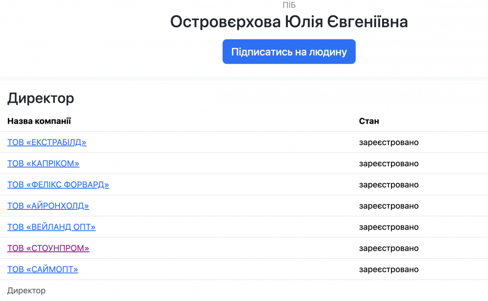 Фіктивність компаній підтверджується ще й такими фактами. Наприклад, засновницею та директоркою «Стоунпром» та ще десятка інших фірми є мешканка Кропивницького Островєрхова Юлія Євгеніївна. Вона у 2022 році була засуджена за ч.4 ст.185 КК до умовного строку за справою № 12022121010001866.