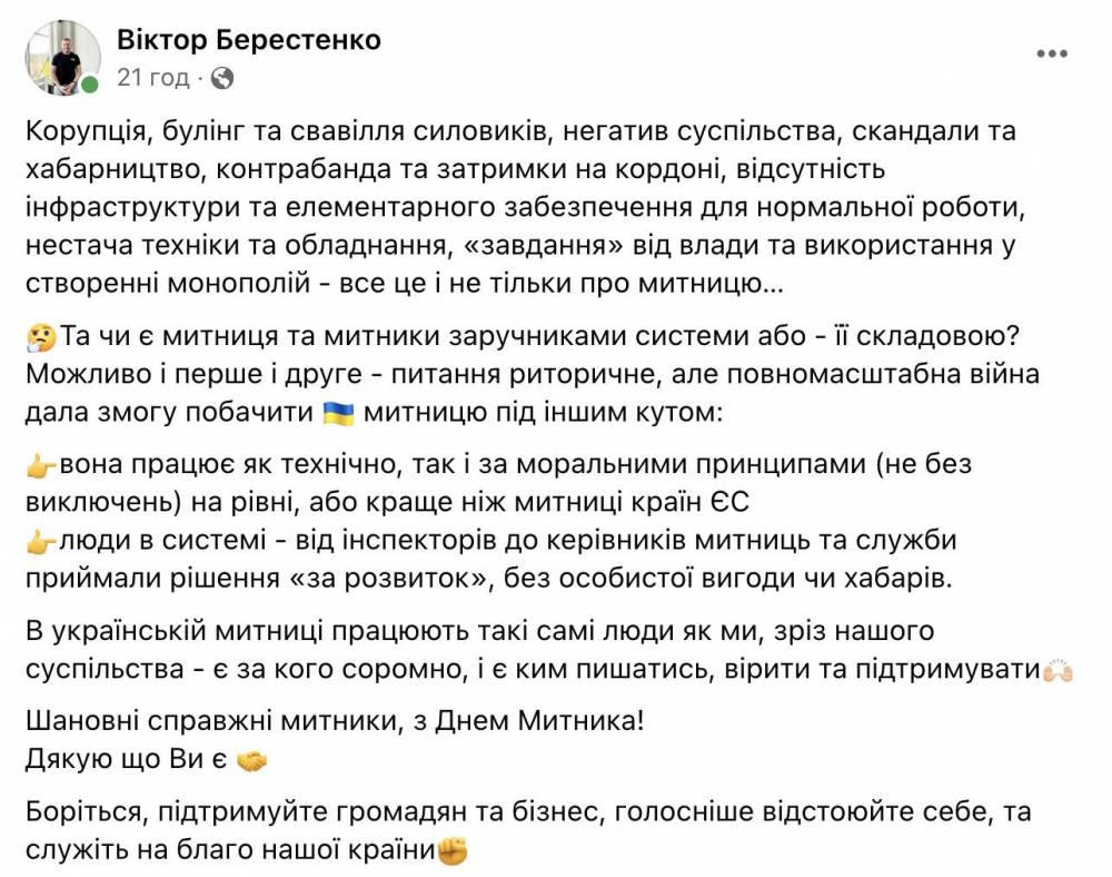 Голова асоціації Віктор Берестенко пішов далі та написав два пости в Facebook про хабарництво та створення монополії.