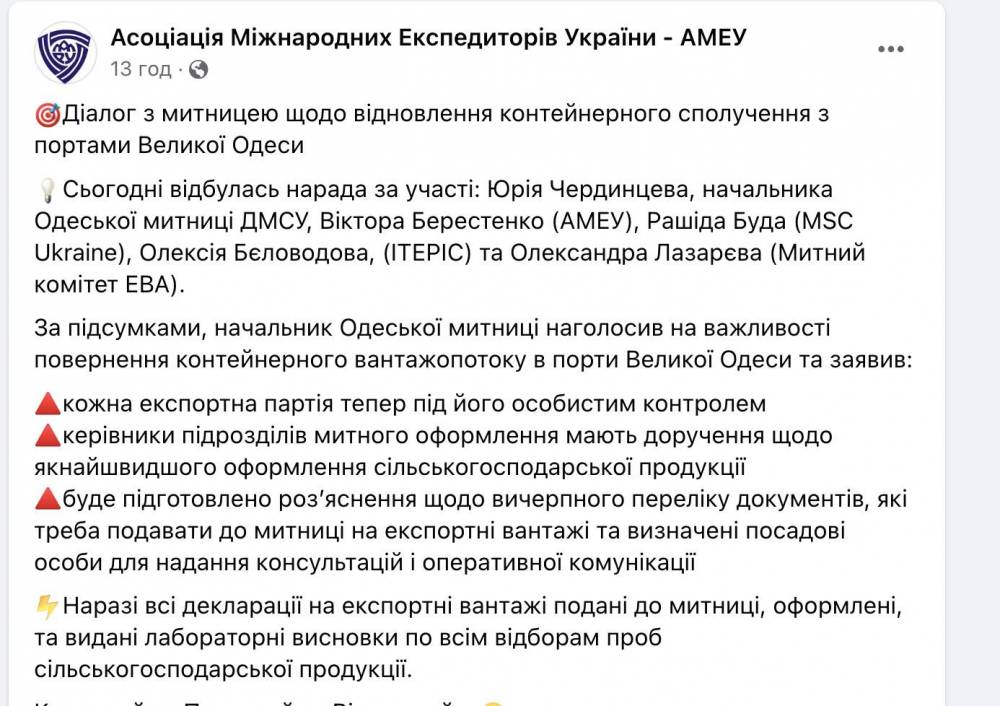 Але не всім це довподоби. Нещодавно Асоціації міжнародних експедиторів України (АМЕУ) заявила, що контейнерний оператор MSC скасував перший суднозахід від початку повномасштабного вторгнення в порт Одеса. За заявою організації, причиною стали «безпідставні перевірки вантажів та затягування митного оформлення експортних контейнерів з сільгоспродукцією на невизначений період», через що вантаж блокується на невизначений строк, та здорожчується через додаткові витрати зі зберігання та демередж, які можуть досягати 2-3 тис. доларів.