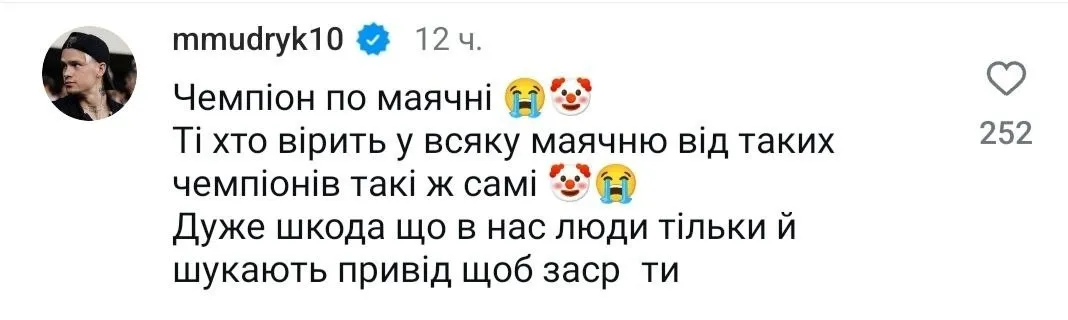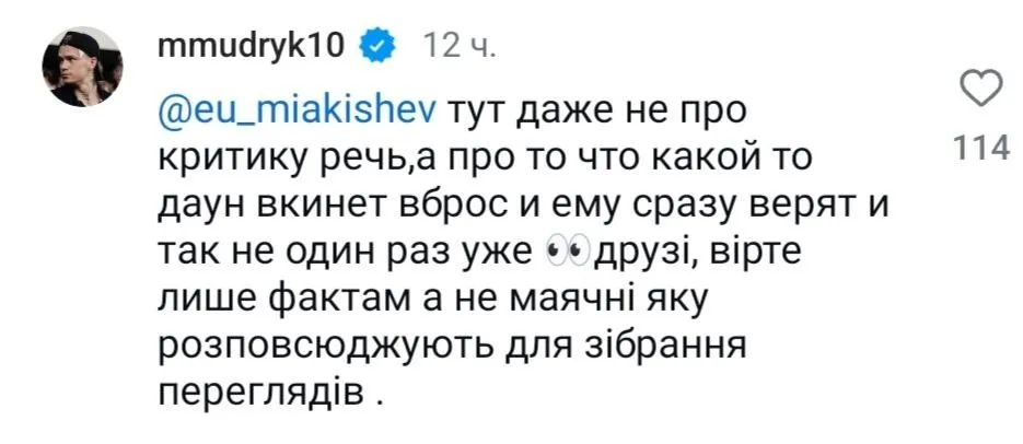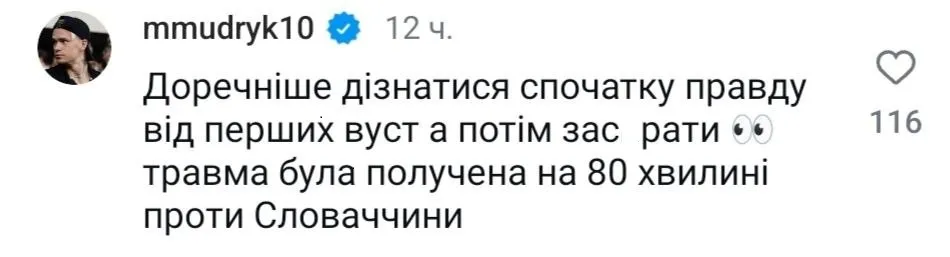 "Чемпіон з маячні. Ті, хто вірить у всіляку маячню від таких чемпіонів, такі ж клоуни. Дуже шкода, що в нас люди тільки й роблять, що шукають привід, щоб заср*ти. Доречніше було б дізнатися правду з перших вуст, а потім зас*ряти. Травму було отримано на 80-й хвилині проти Словаччини. Тут навіть не про критику. А про те, що якийсь даун зробить вкид, і йому одразу вірять. І так уже було неодноразово. Друзі, вірте лише фактам, а не маячні, яку розповсюджують заради збирання переглядів", – написав Мудрик.