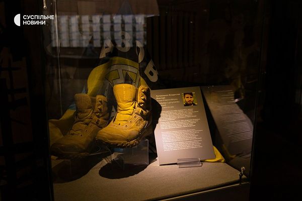 Речі бійця полку "Азов" Владислава з позивним "Вектор" в Національному музеї історії України. Київ, 18 червня 2024 року. Ці черевики "Вектор" позичив побратиму перед загибеллю. Побратим зберіг черевики у полоні, а після звільнення з полону передав батькам Влада.