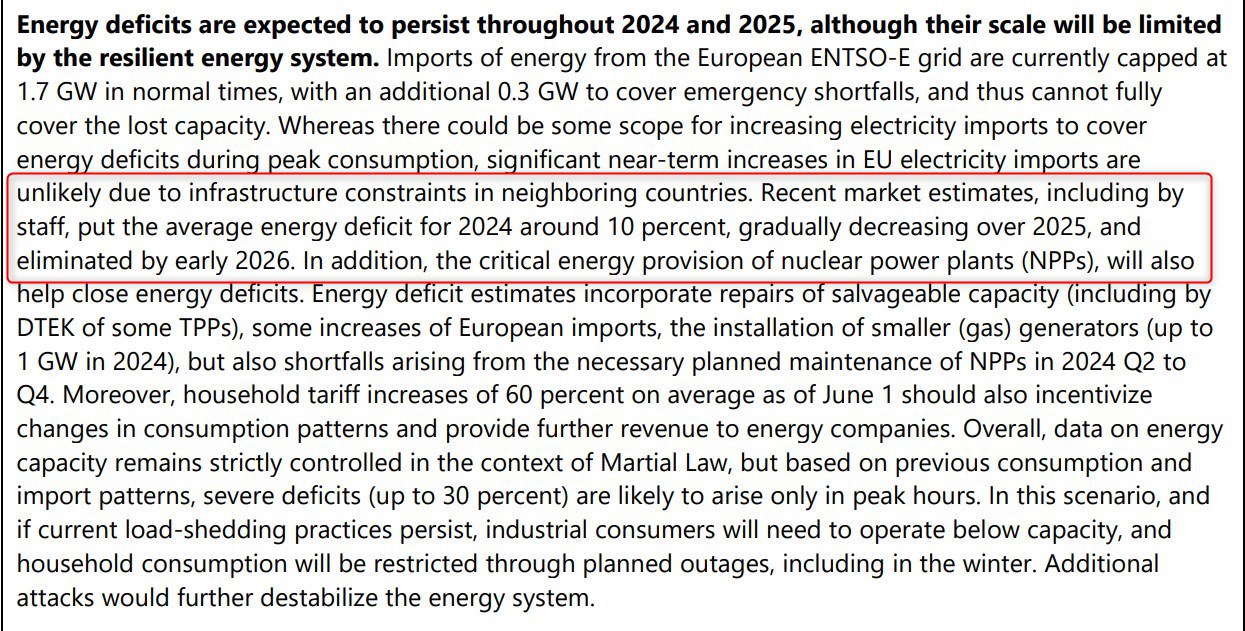 "Очікується, що дефіцит енергії зберігатиметься протягом 2024 та 2025 років. За останніми ринковими оцінками, у тому числі за оцінкою персоналу [МВФ], у середньому енергодефіцит на 2024 рік становитиме близько 10%, поступово зменшуватиметься протягом 2025 року та буде ліквідований на початок 2026 року", – йдеться у меморандумі.