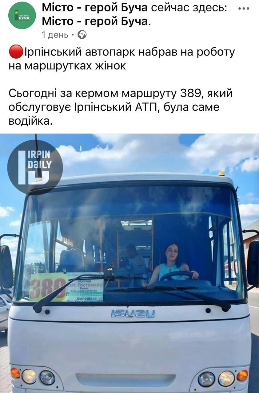 Місцеві паблики повідомляють, що в Ірпені набрали працювати жінок-водійок маршруток.