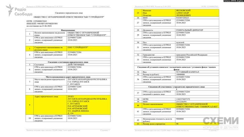 З того ж відкритого реєстру юросіб Росії журналісти «Схем» дізналися, що у 2021 році за адресою луганського гіпермаркету зареєстрували приватну фірму з такою ж назвою – ООО «Стройцентр». І з моменту реєстрації, відповідно до відкритих даних, її фінансові показники суттєво зросли. Зокрема, виручка у 2023-му склала 1,7 мільярда рублів (19,5 мільйона доларів), у порівнянні з виручкою в 1 мільярд рублів (еквівалент в доларах) – у 2022-му.
