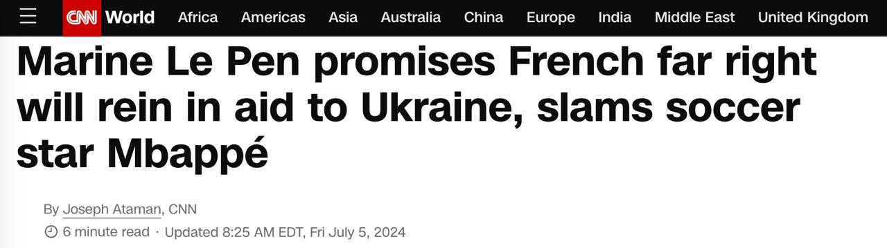 CNN пише, що Марін Ле Пен заявила, що у разі перемоги на виборах прем’єр-міністр від її Національного об’єднання заблокує відправку французьких військ в Україну.