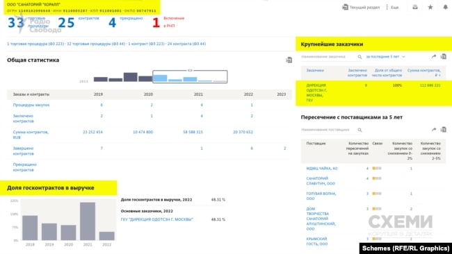 За підрахунками журналістів «Схем» за період з 2015 по кінець 2022 років, російський «Корал» отримав від влади РФ контрактів на 196,48 мільйона російських рублів (це 2,2 мільйона доларів США). Останню угоду з «Дирекцією з забезпечення діяльності організацій праці» укладено у травні 2022 року. Крім цього, ООО «Санаторий «Коралл» у часи епідемії COVID-19 отримав російської державної підтримки на суму близько 20 тисяч доларів США.