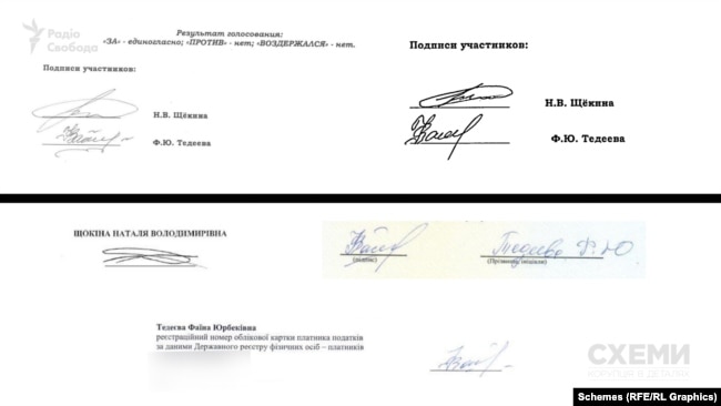 Журналісти «Схем» отримали протокол зборів від листопада 2014 року, на яких ухвалювалося рішення про реєстрацію російського ООО «Санаторий «Коралл» у Криму у «зв’язку з приведенням у відповідність до законодавства Російської Федерації». На ньому є підпис і Наталії Щокіної, і Фаїни Тедеєвої. Віктор Крейдич, як зазначено, був відсутнім.