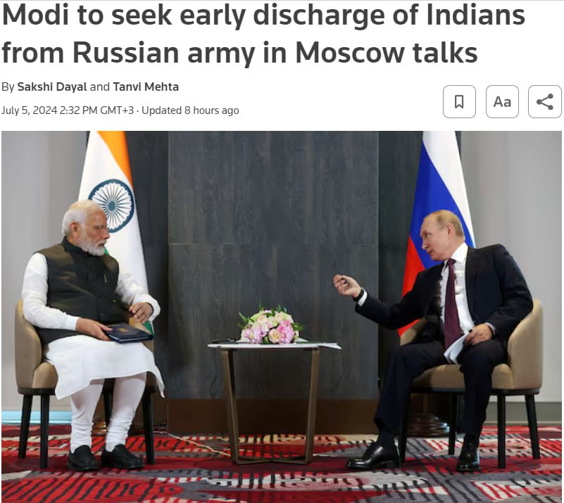 Reuters повідомляє, що прем’єр-міністр Індії під час візиту до Москви добиватиметься звільнення громадян Індії з армії РФ.