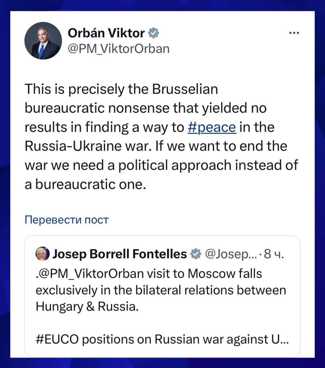 «Це через бюрократичне марення Брюсселя зусилля щодо встановлення миру в Україні не мають результатів», – написав він у Х, коментуючи твіт Барреля.