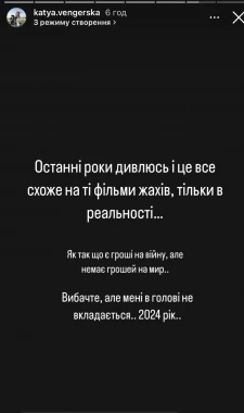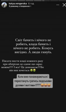 "Світ бачить і нічого не робить, влада бачить і нічого не робить. Комусь вигідно. А люди гинуть. Писати пости владі кожного разу при обстрілах - це єдине, що зараз можна? І все? Це допомагає? Коли вже понажираються і перестануть гратись людськими долями і життями? Останні роки дивлюсь, і це все схоже на ті фільми жахів, тільки в реальності. Як так що є гроші на війну, але немає грошей на мир", - обурилася блогерка.