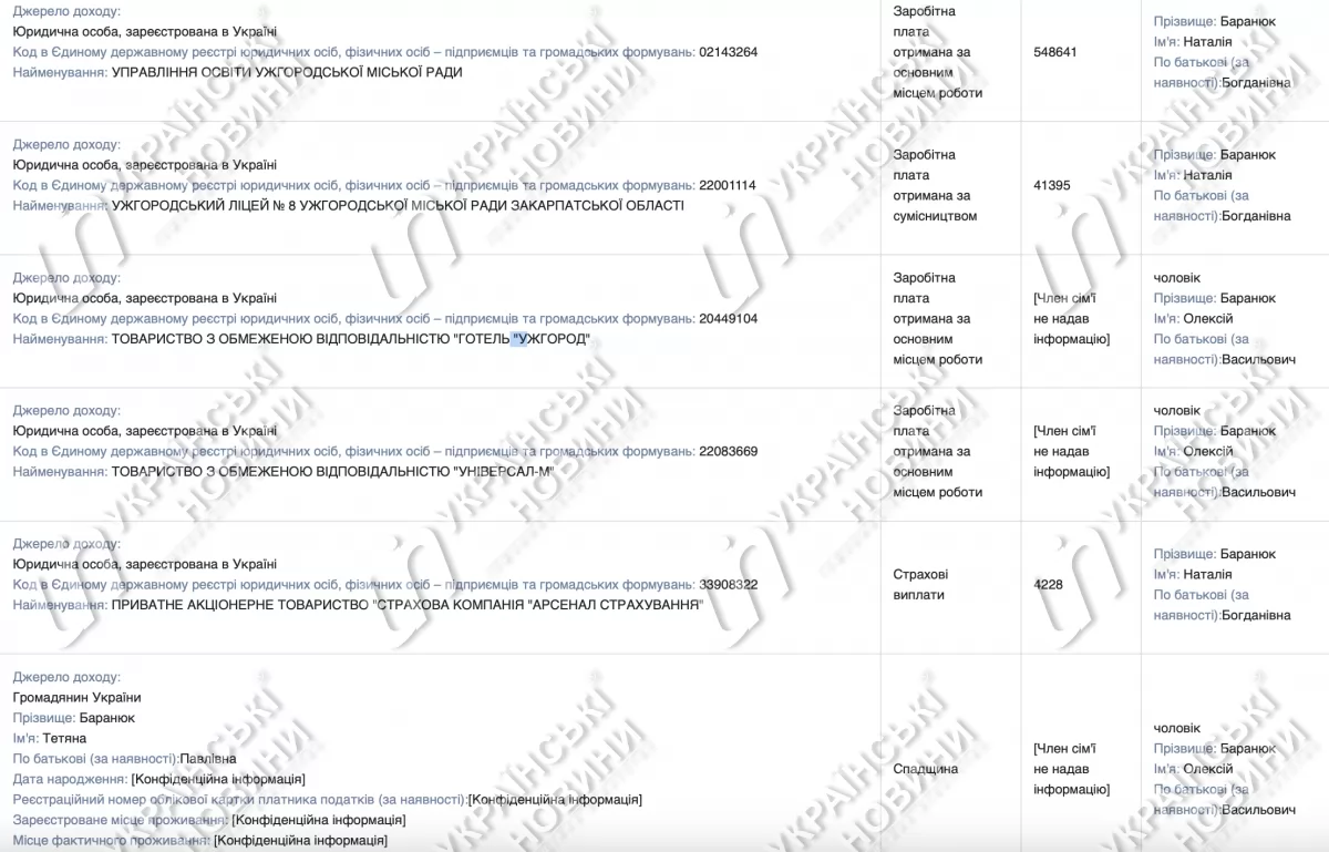 Доходи Баранюк за 2023 рік становили 594,2 тис. гривень, з яких 548 тис. гривень – зарплата в управлінні освіти, 41,3 тис. гривень – зарплата в Ужгородському ліцеї.