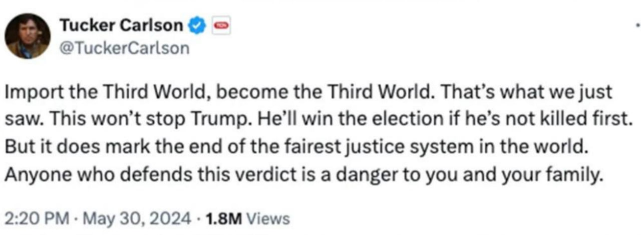 "Вони двічі оголошували йому імпічмент під безглуздими приводами. Це не спрацювало. Він повернувся. Тоді вони звинуватили його. Це не допомогло. Він став ще популярнішим. Тоді його звинуватили ще три рази. І щоразу його популярність зростала. Що далі? Очевидно, що ми наближаємося до замаху на вбивство", – каже Карлсон на відео.