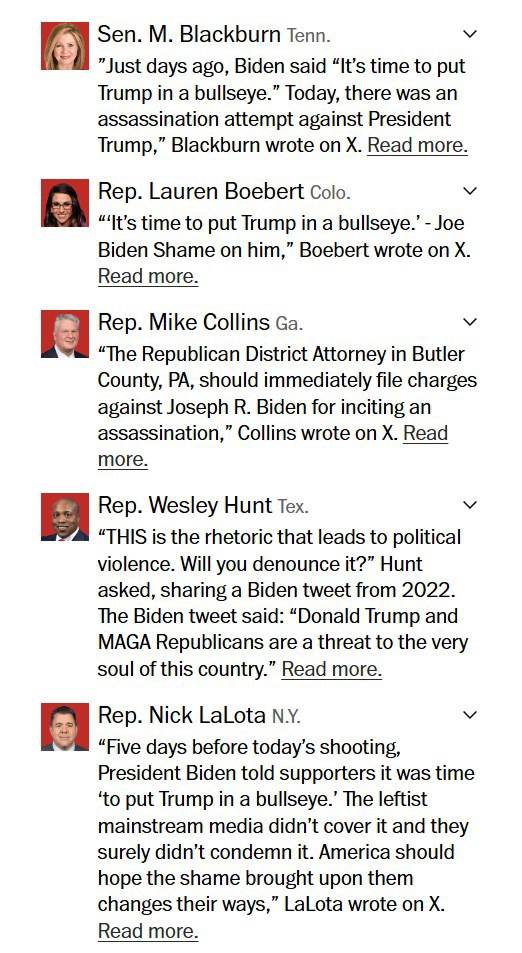 Газета Washington Post нарахувала вісім членів обох палат Конгресу, які відкрито заявили, що президент США пов’язаний із цим замахом (на скріншотах).
