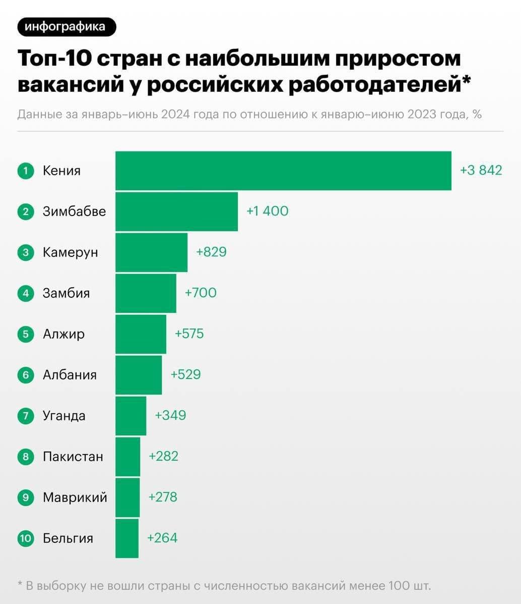 За підсумками першого півріччя кількість вакансій у Кенії зросла у 39 разів, у Зімбабве – у 14 разів, у Камеруні – у 8 разів, у Замбії – у 7 разів, в Алжирі – у 5,7 раза.