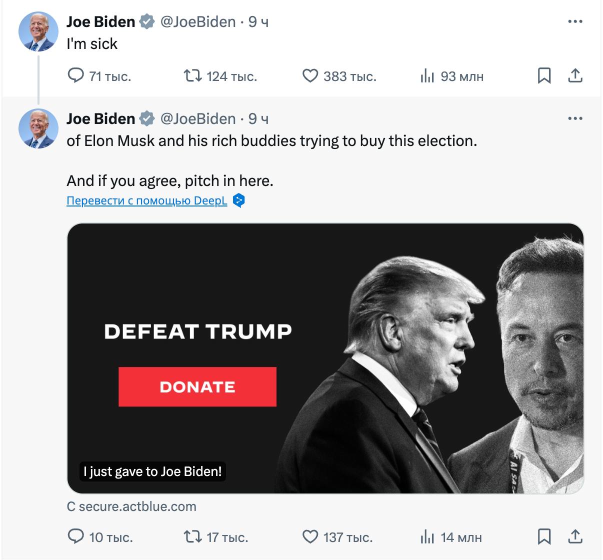 Потім цю тему порушив Байден. Він розкритикував як Венса, так і Маска. "Мене нудить від Ілона Маска та його багатих дружків, які намагаються купити ці вибори", - йдеться у повідомленні президента у Х.