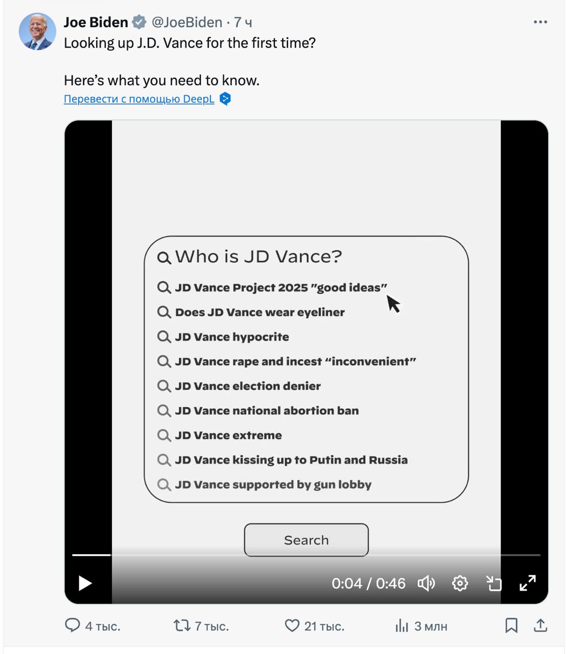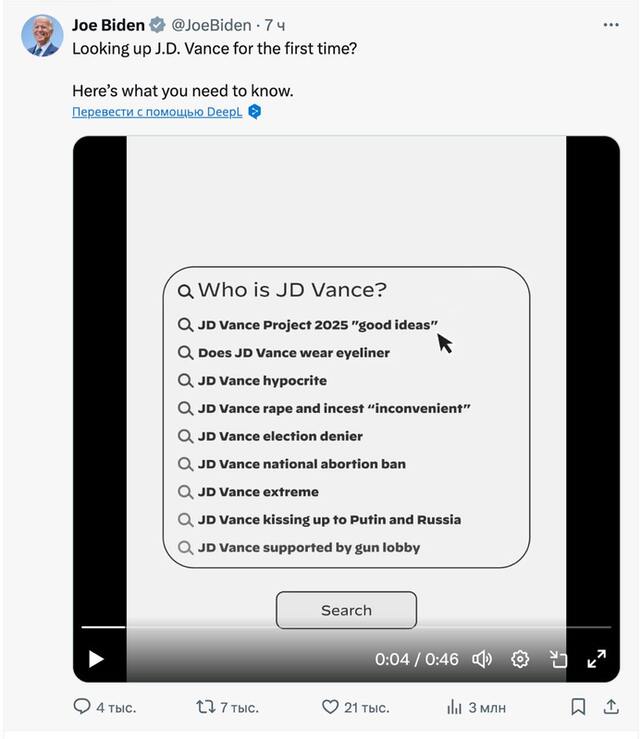 «Ви вперше чуєте про Джея Ді Венса? Ось що вам треба знати", - йдеться в іншому повідомленні Байдена з відео, де опоненти звинувачують Венса в "заграванні Путіним та Росією", "лицемірстві", "екстремізмі" та інших речах, аж до підведення очей.