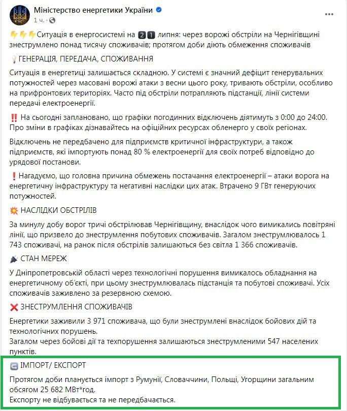 Упродовж доби Україна планує імпортувати з Румунії, Словаччини, Польщі та Угорщини електрики загальним обсягом 25 682 МВт/год.