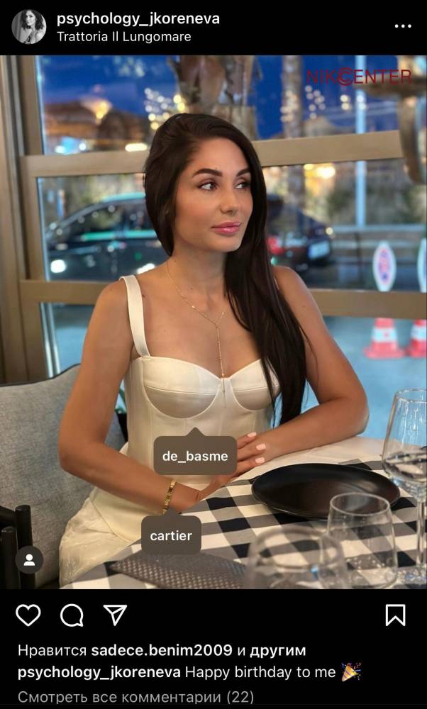 Якщо це оригінал, то вартість браслета Love може становити від 4 до 17 тис. євро. Ціна прикраси залежить від оздоблення діамантами та їхньої кількості, які неможливо оцінити по оприлюднених Коренєвою фото та відео. Вартість браслету-цвяха від Картьє може сягати 25 тисяч євро, теж залежно від оздоблення. Ціни на каблучку-цвях можуть складати до 5 тис. євро. Привертає увагу, що Юлія Коренєва до опублікованих світлин з брендовими речами відмічає на них і офіційні сторінки цих брендів, натякаючи на їхню оригінальність.