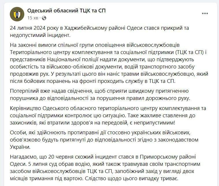 У відомстві зазначили, що інцидент стався в Хаджибейському районі. Та додали, що на законні вимоги спільної групи оповіщення військовослужбовців ТЦК та поліції надати документи, що підтверджують особу, та військово-облікові документи, водій транспортного засобу продовжив рух.