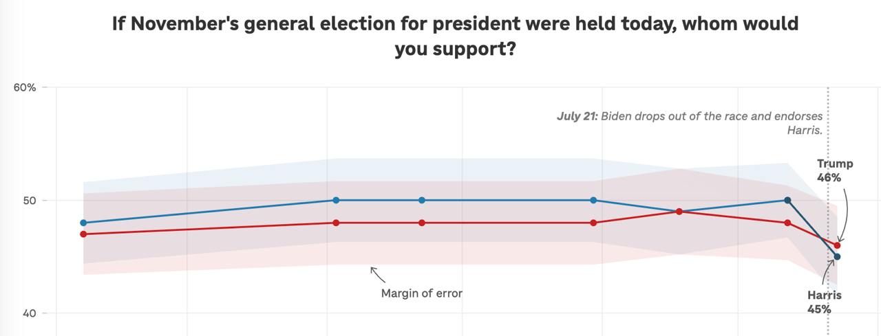 Опитування NPR показує, що Трамп випереджає Гарріс 46% проти 45%.