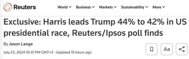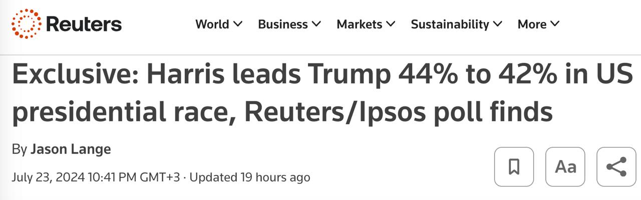 А опитування REUTERS/IPSOS показує, що Гарріс випереджає Трампа 44% проти 42%.