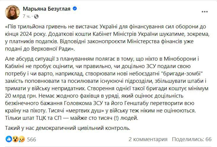 "Створення однієї такої бригади коштує щонайменше 20 млрд грн. Немає жодного фахівця в уряді, який оцінює доцільність нескінченного бажання Головкому ЗСУ та його Генштабу перетворити всю країну на піхоту. Тисячі «мертвих душ» в армії також ніким не оцінюються. Лише штат ТЦК та СП майже сто тисяч (!) осіб", — пише Безугла.