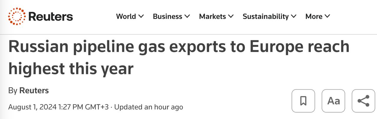 Reuters пише, що Європа в липні закупила рекордний обсяг російського трубопровідного газу цього року.