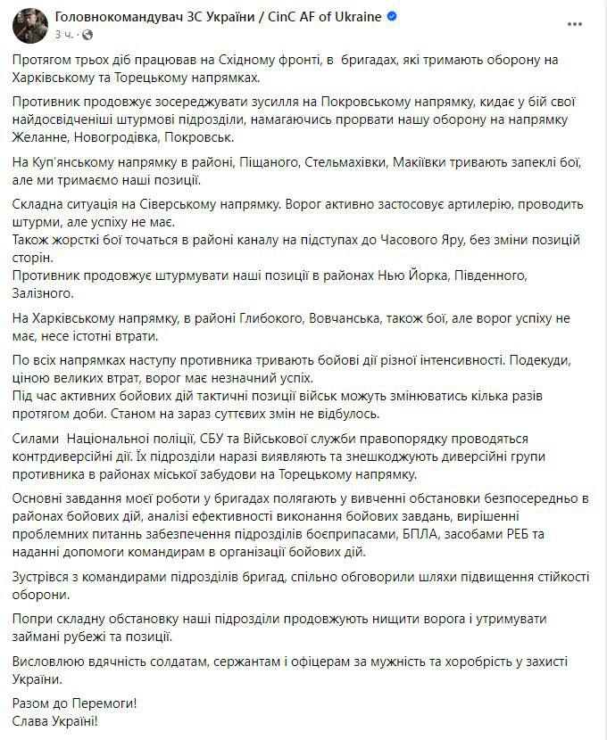 Він пише, що "диверсійні групи противника виявляють та знешкоджують у районах міської забудови на Торецькому напрямку".