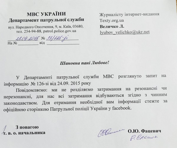 Ответ патрульной службы на запрос ТЕКСТОВ