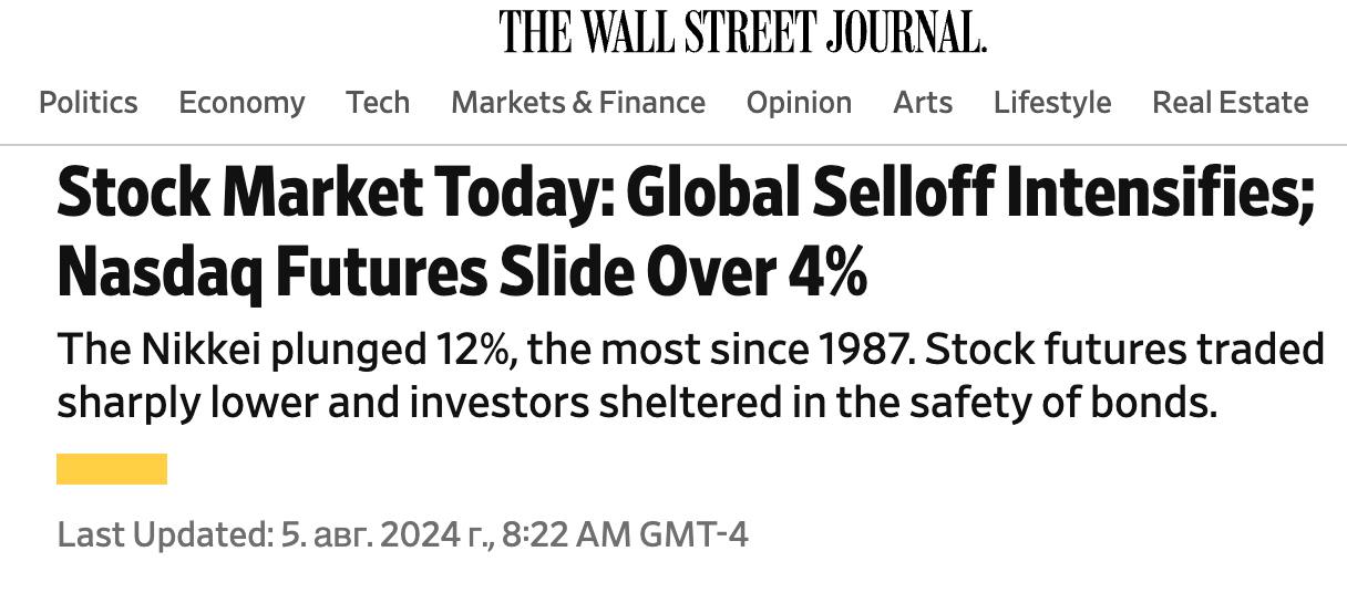 У понеділок, 5 серпня, глобальні фондові ринки зазнали різкого падіння. Це сталося на тлі побоювань щодо рецесії у США. Торги у Сполучених Штатах стартували о 16:30 за київським часом. Економісти побоюються, що США відбудеться різкий спад.