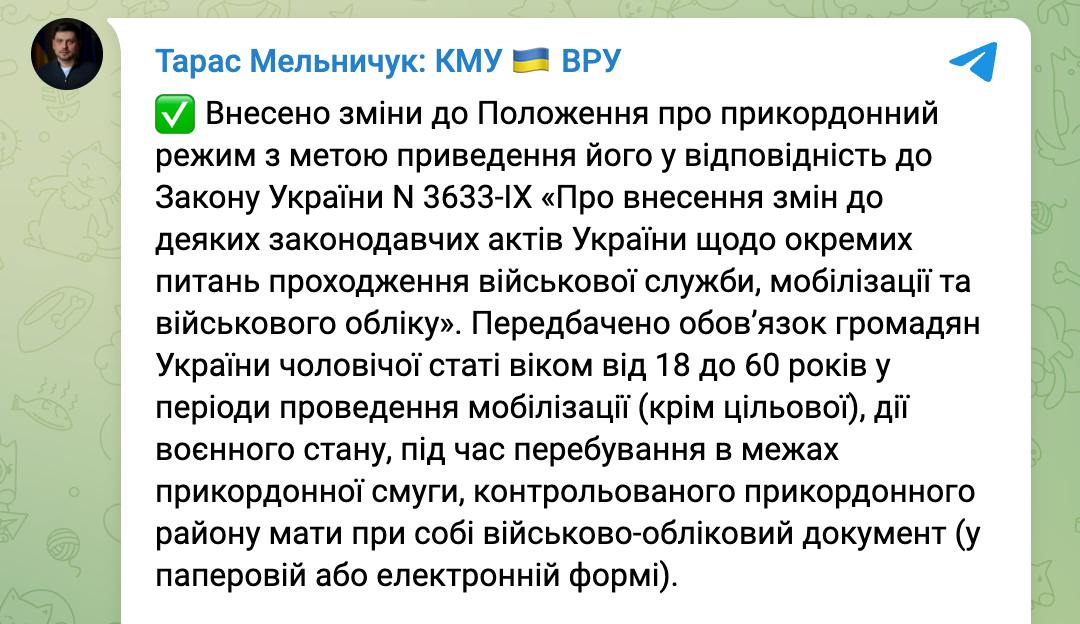 Тепер чоловіки-громадяни призовного віку повинні мати при собі військово-обліковий документ, коли вони перебувають у межах прикордонної смуги або контрольованого прикордонного району. Це положення діє при проведенні мобілізації (крім цільової) та військовому стані.
