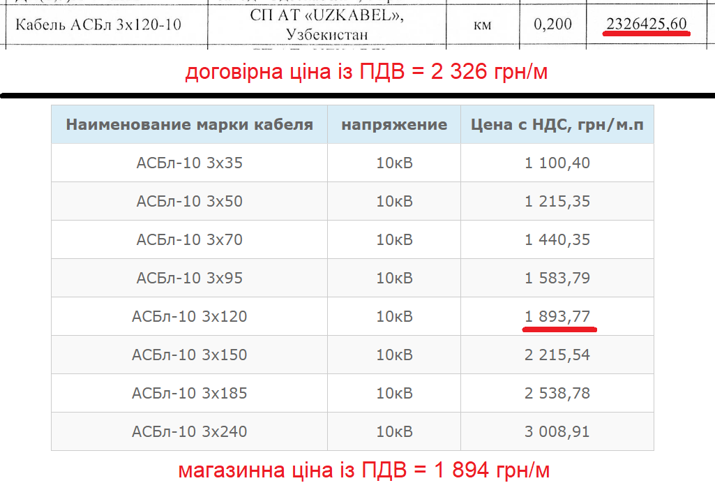 Також 1,94 млн грн відведено на кабелі АСБл-10, прайсові ціни яких у середньому на 17% нижчі. Так, кабель АСБл-10 3х120 коштує 2 326 грн/м, а в «Укрпроводу» – 1 894 грн/м.