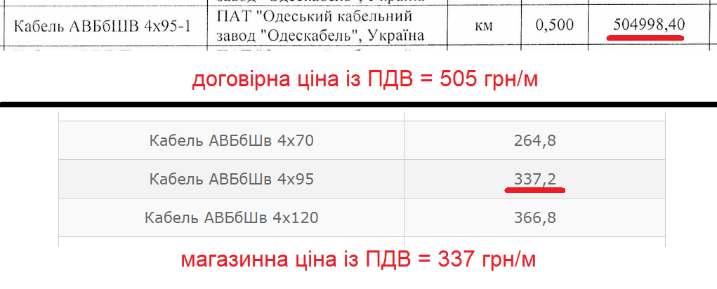 Крім того, 1,05 млн грн припадає на кабелі АВБбШв, прайсові ціни яких у середньому на третину нижчі. Наприклад, у договорі кабель АВБбШв 4х95 коштує 505 грн/м, тоді як в «Укрпроводу» – 337 грн/м. Крім того, у липні харківське КП «Міськсвітло», після новини «Наших грошей» у червні, зменшило ціну саме такого кабелю із 537 грн/м до 402 грн/м.