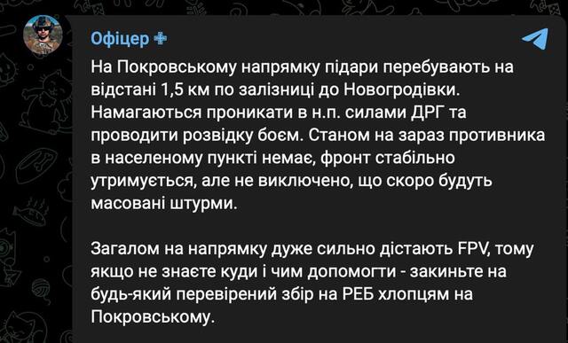 Інший офіцер із позивним «Алекс» інформує, що росіяни знаходяться за півтора кілометра від сусідньої Новогродівки і відправляють туди диверсійно-розвідувальні групи.