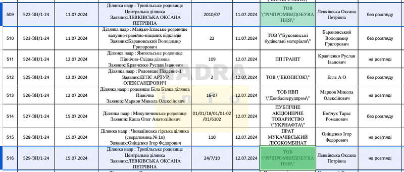 Дані слідства про відчуження спецдозволу на Трипільське родовище (ділянка Центральна) опосередковано підтверджують реєстр заяв Державної служби геології та надр України. ТОВ «Річпромвидобування», яке на червень 2024 року не було надрокористувачем, у липні двічі зверталося до Держгеонадр із заявами щодо згаданого родовища: