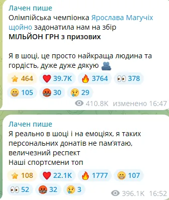 "Олімпійська чемпіонка Ярослава Магучіх щойно задонатила нам на збір мільйон грн з призових. Я в шоці, це просто найкраща людина та гордість, дуже-дуже дякую. Я реально в шоці і на емоціях, я таких персональних донатів не пам’ятаю, величезний респект. Наші спортсмени – топ", – повідомив Лаченков.