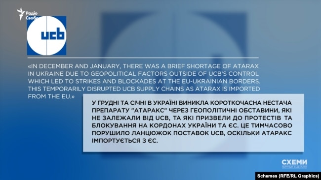 В UCB Pharma дефіцит препарату «Атаракс» в Україні минулої зими пояснили блокуванням мітингувальниками польсько-українського кордону, що спричинило перебої у постачанні.