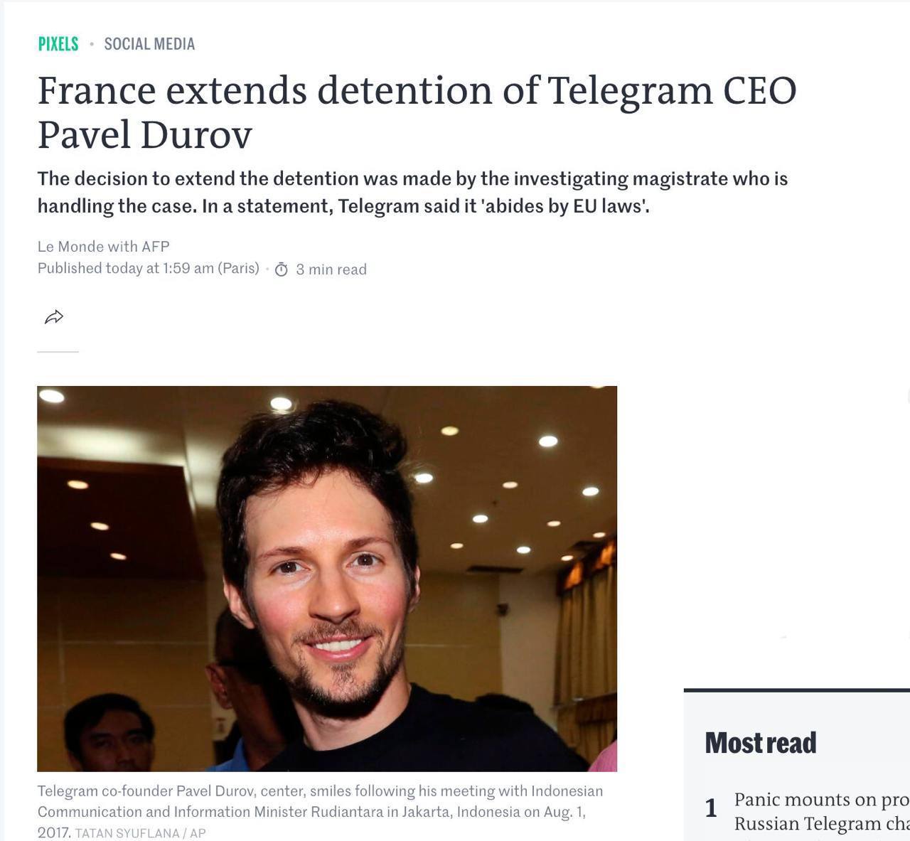 Відомо, що французькі судові органи продовжили термін утримання засновника Телеграм під вартою ще на 48 годин. Термін затримання для допиту.