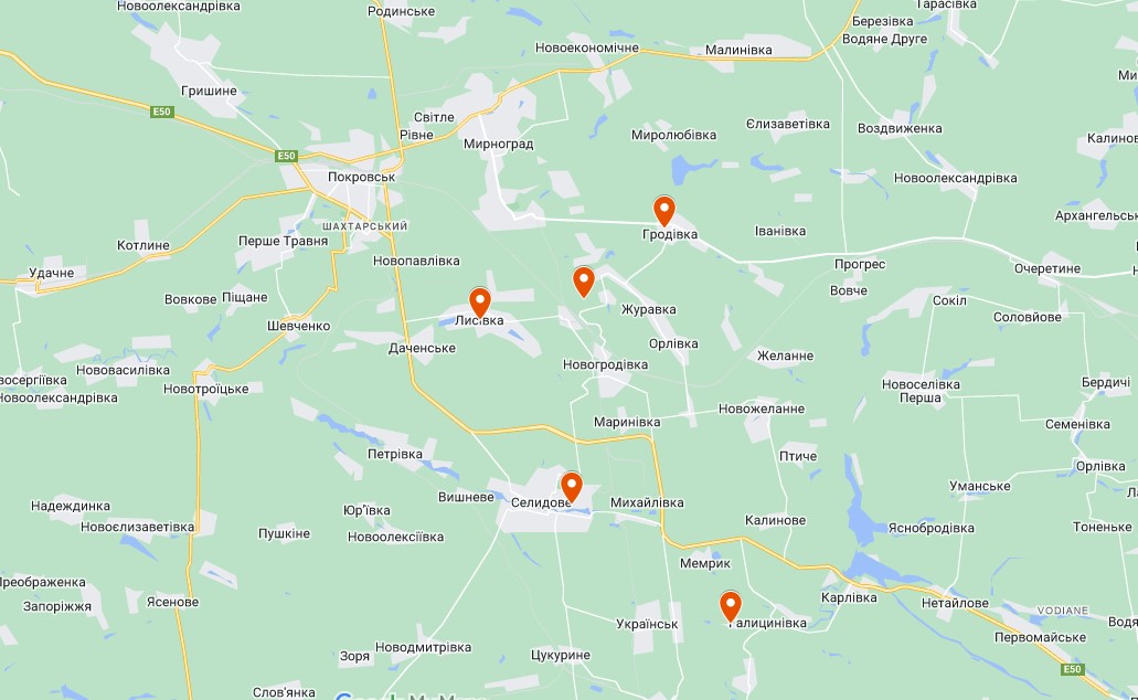На Google maps можна відзначити населені пункти, про які згадував боєць. Спостерігаємо російський "клин", який наближається до Покровська і оточує Селидове.