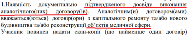 Крім того, для участі в торгах треба було надати аналогічний договір на ремонт чи будівництво об’єктів медичної сфери. Аналогічна вимога оскаржувалась в АМКУ по іншій закупівлі, і колегія зобов’язала київських освітян змінити тендерну документацію.