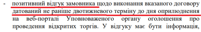Також треба було мати відгук про виконання аналогічного договору, датований не раніше двох тижнів до оголошення відкритих торгів.