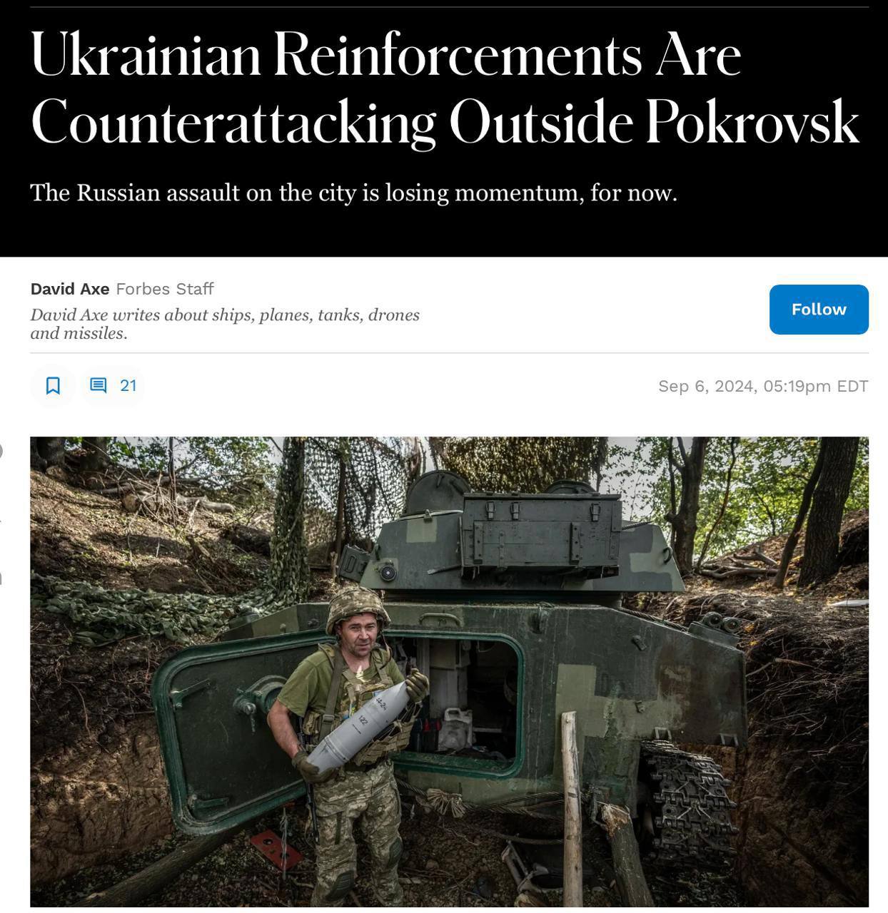 "Тепер, коли свіжі і добре оснащені українські війська перебувають в Селидовому і контратакують, захоплення Покровська російськими військами, яке раніше здавалося неминучим, виглядає трохи менш ймовірним", — пише Forbes.