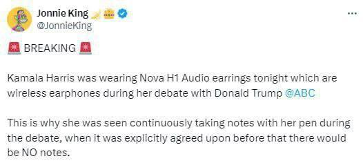 У мережі зʼявилася версія, що Гарріс використовувала навушники на дебатах із Трампом: музикант Джонні Кінг звинуватив її у шахрайстві.