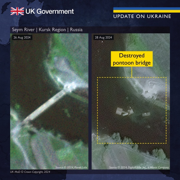 "Україна продовжує ускладнювати логістику Росії в Курській області серією атак, які зруйнували автомобільні та понтонні мости через річку Сейм", - йдеться у повідомленні.