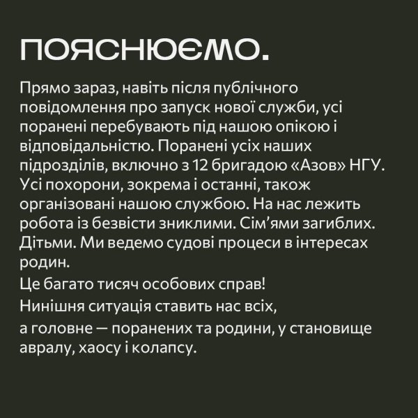 "Прямо зараз, навіть після публічного повідомлення про запуск нової служби, усі поранені залишаються під нашою опікою і відповідальністю. Поранені усіх наших підрозділів, включно з 12-ю бригадою НГУ "Азов". Усі похорони, зокрема й останні, також організовані нашою службою. На нас лежить робота з безвісти зниклими, родинами загиблих, дітьми. Ми ведемо судові процеси в інтересах родин. Це багато тисяч особових справ. Нинішня ситуація ставить нас всіх, а головне – поранених та родини, у становище авралу, хаосу і колапсу", – йдеться у заяві.